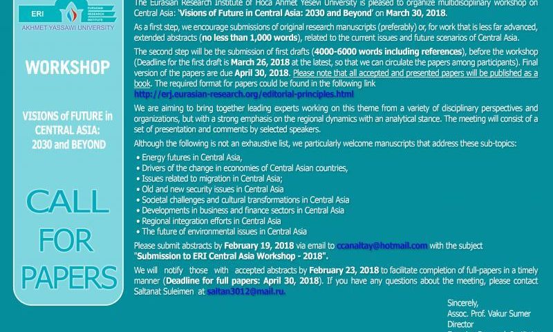 We are organizing a workshop on the topic of Visions of Future in Central Asia: 2030 and Beyond on March 30, 2018. The aim of this workshop is to bring together leading experts on this theme from a variety of disciplinary perspectives and organizations, but with a strong emphasis on the regional dynamics with an analytical stance. Moreover, we want this workshop to contribute literature on Central Asian studies with a published book. Therefore, we are inviting experts interested in this theme to send us their extended abstracts (no less than 1,000 words) by February 19, 2018, and their first draft on March 26, 2018, so we can discuss the topics together in the workshop. We are expecting final versions of the papers on April 30, 2018. The paper guideline is at the following link. http://erj.eurasian-research.org/editorial-principles.html You can find more information on our announcement in the attachment.