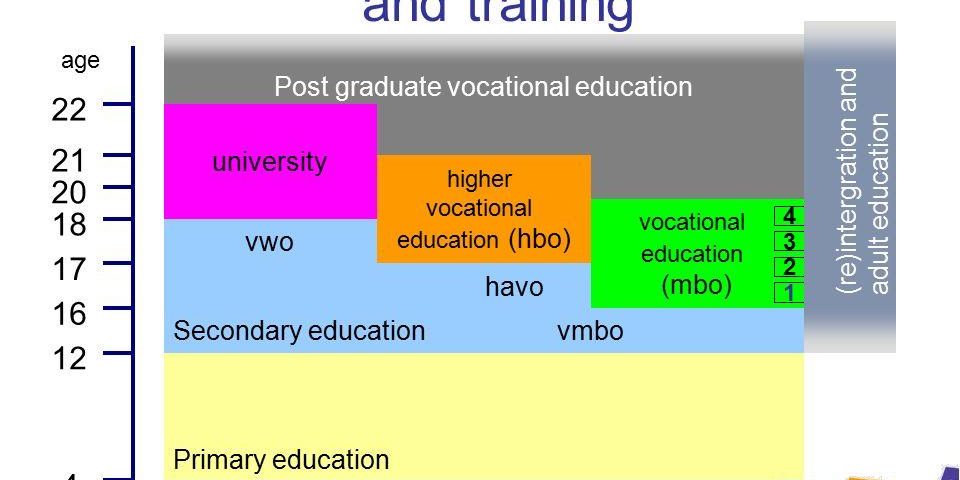 For students who scored less the next level is designed – VMBO – 4-year professional education course, which includes the study of general subjects and receipt of professional preparation. This course is divided to 5 sub profiles: “Theoretical Learning Path” provide the largest stratum of theoretical knowledge. It is designed to prepare middle management and provides the “middle-level applied education” (MBO) level of tertiary education. “Middle Management-oriented Learning Path” is composed of an equal amount of vocational training and theoretical education. “Mixed Learning Path” is something in between two previous profiles. “Basic Profession-oriented Learning Path” focuses on vocational trainings and prepares for vocational training at the MBO level of tertiary education. “Practical Education” mostly consists of vocational training.