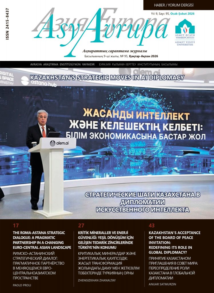 Asya Avrupa dergisinin 95. sayısında, Avrasya coğrafyasının dönüşen parametrelerini disiplinlerarası bir perspektifle mercek altına alıyoruz. Bu sayımızda; yapay zekâ diplomasisi, Kazakistan’ın çok vektörlü dış politikası, yükseköğretimin uluslararasılaşması ve enerji güvenliği gibi stratejik başlıkların yanı sıra kurumsal güven ve çevresel krizler gibi sosyopolitik meseleler analitik bir yaklaşımla ele alınmaktadır.