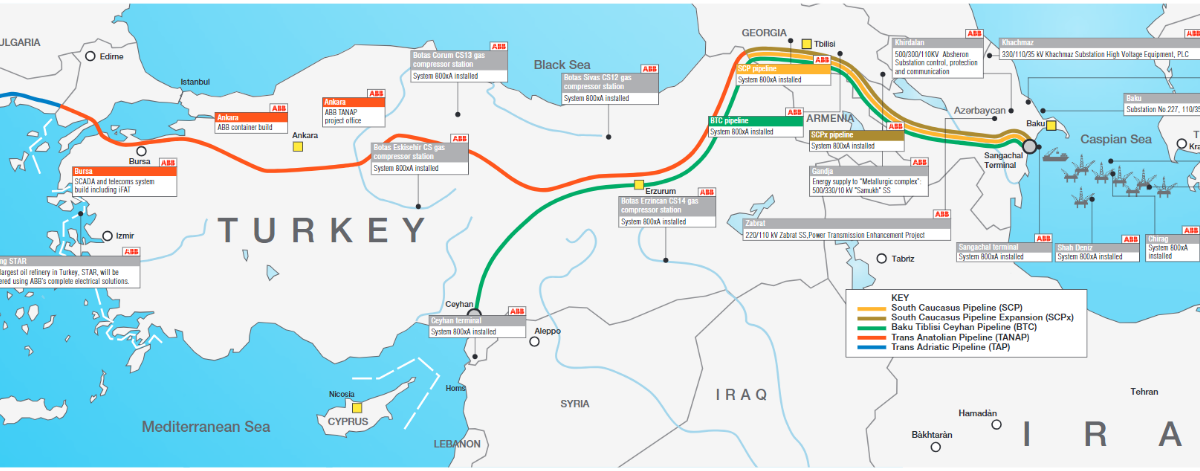 [1] The SGC is running through Azerbaijan, Georgia, Turkey, Greece and Albania, joining the European network in Italy. The $11 billion TANAP pipeline will connect the South Caucasus Pipeline and the Trans Adriatic Pipeline (TAP) at Turkey’s border with Greece.